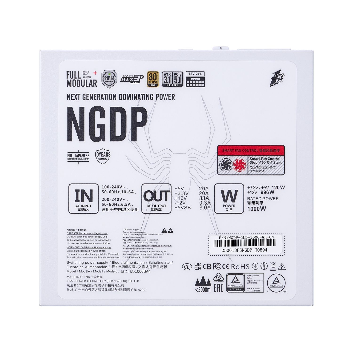 Specificații: Sursa PC 1stPlayer® 1000W, 80 PLUS® Gold, Full Modular, ATX 3.1, PCIe 5.1, PFC activ, NGDP HA-1000BA4, alb